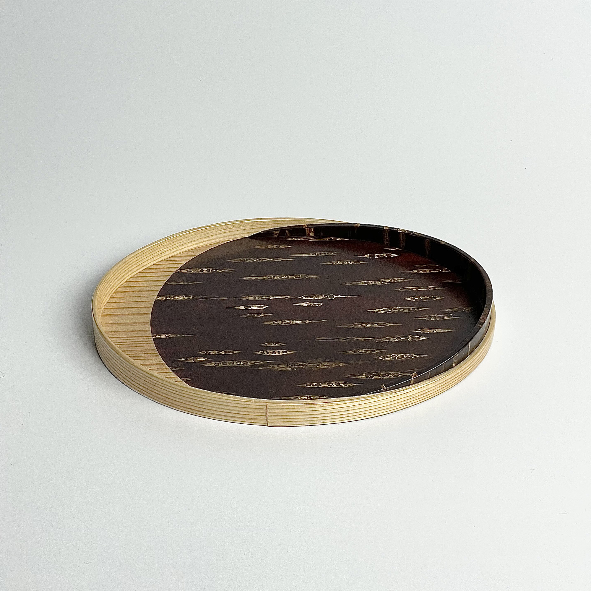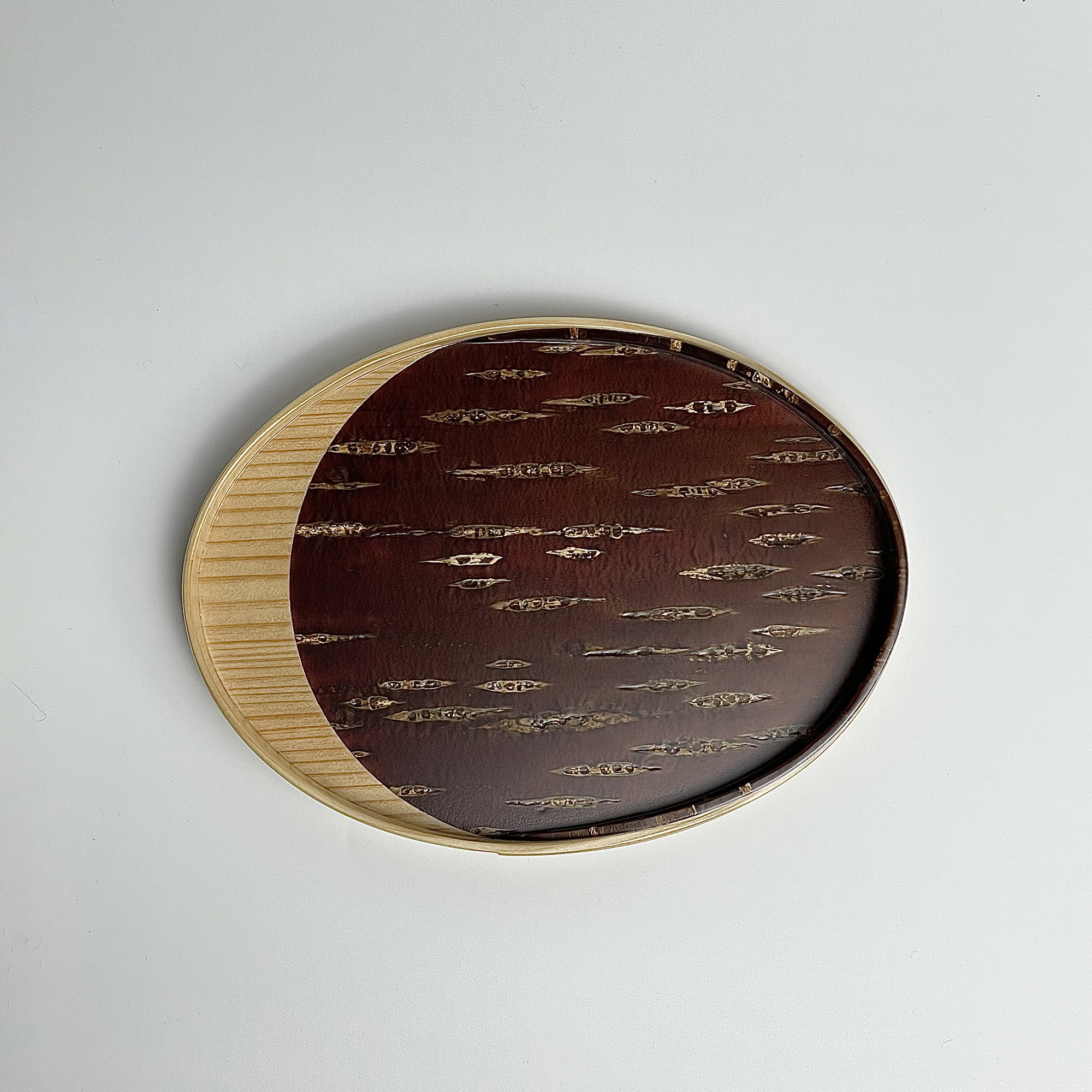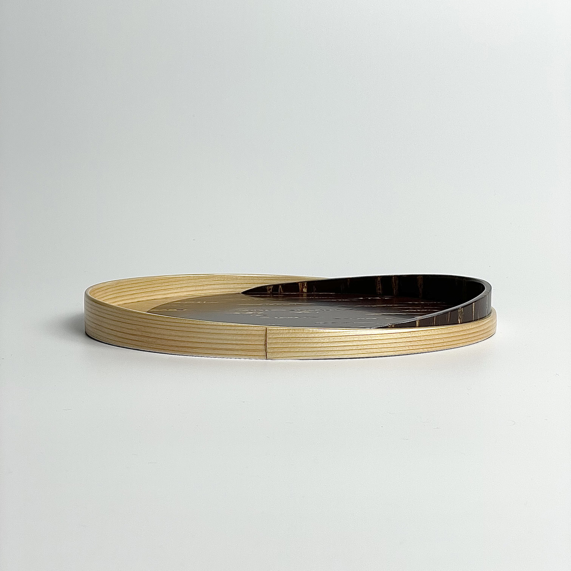 Le plateau a la forme d’un cœur lorsqu’on le regarde de face. Les combinaisons contrastées sont efficaces pour faire ressortir certains éléments. La composition bicolore des matériaux – bouleau (écorce de cerisier de montagne) et cèdre d’Akita – crée un beau contraste. Ce petit plateau d’accueil peut également être utilisé comme plat à pâtisserie.